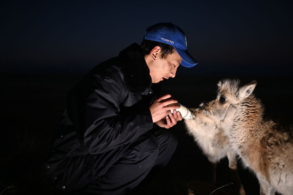 可可西里巡山隊員才文多杰在索南達杰保護站內給被救助的藏羚羊幼仔喂奶(1月18日攝)。新華社記者 張宏祥 攝