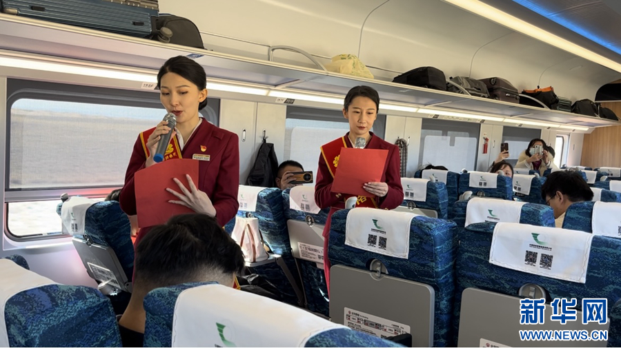 車廂內(nèi),喜慶的燈籠高高掛起,紅色的對聯(lián)、剪紙點綴其間,濃厚的新年氛圍撲面而來。過道里,乘務員們的律動操、音樂快板、詩朗誦等精彩節(jié)目令人目不暇接,乘客們紛紛拿起手機拍照錄像記錄。