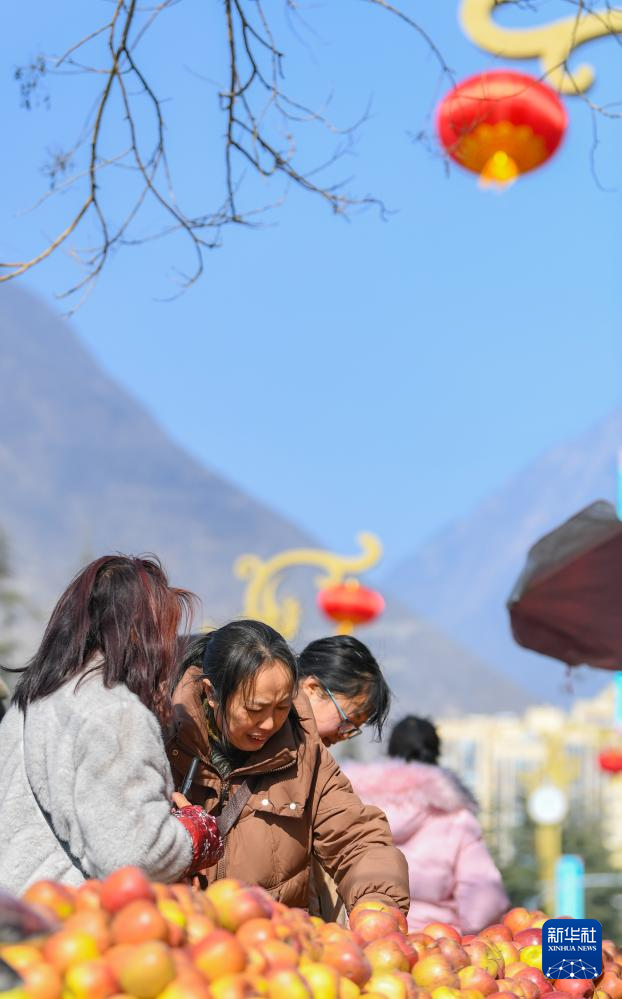1月28日,在四川阿壩藏族羌族自治州茂縣水果交易市場,來自成都的游客在選購蘋果。新華社記者 王曦 攝