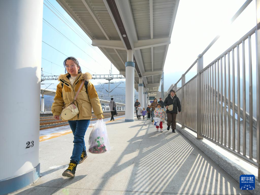 1月28日,在川青鐵路茂縣站,旅客帶著購買的蘋果準備登車。新華社記者 王曦 攝