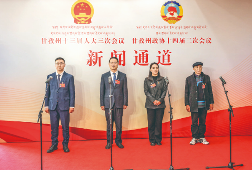 1月30日下午,甘孜州十三屆人大三次會議“代表通道”正式開啟。瀘定縣委副書記、縣長王蕾,得榮縣日雨鎮黨委書記江潔,亞丁景區管理局游客服務科科長余光榮,瀘定縣磨西鎮青岡坪村支部書記、村委會主任呂東才四位州人大代表在現場回應社會關切熱點。