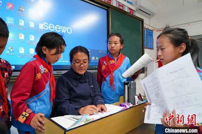 2023年6月20日,德欽縣第一小學的老師為學生輔導作業。中新社記者 劉冉陽 攝