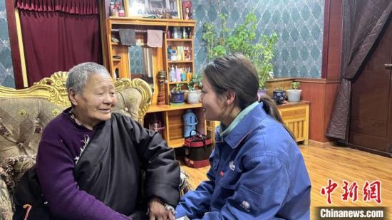 圖為扎西拉毛(右)在結拉村老人家中講解安全用電知識,主動咨詢用電需求。普布永措 攝