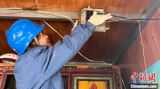 圖為扎西拉毛在結拉村義務檢查線路和更換開關。普布永措 攝