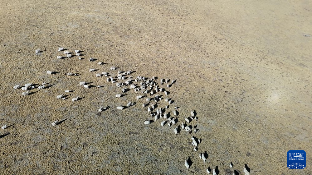 1月27日,在青海省海北藏族自治州剛察縣泉吉鄉寧夏村,羊群正在覓食(無人機圖片)。任元昊 攝