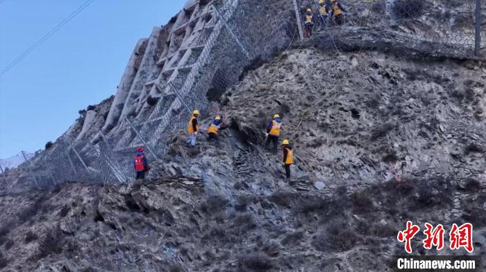 踩著積雪,沿著將近70度的陡坡攀爬一個(gè)多小時(shí)后,“攀巖小隊(duì)”終于抵達(dá)距川青鐵路垂直高度達(dá)500多米的巡查點(diǎn)。寒風(fēng)凜冽,大家顧不上休息,抓緊掃除山上的危巖,檢查防護(hù)網(wǎng)安裝情況。這是近日發(fā)生在四川省阿壩州川青鐵路沿線的一幕。