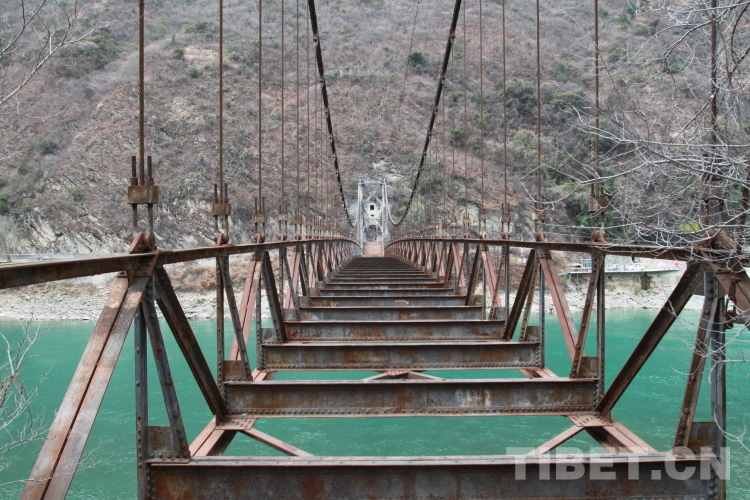 該橋始建于1950年11月。當時為了徹底解放西藏、鞏固西南邊防,中國人民解放軍第十八軍在劉伯承、鄧小平、賀龍等同志“一面進軍,一面建設”的號召下,在修筑川藏公路的同時,由西南交通部負責,廣大解放軍指戰員、全體技術人員和各路民工發揚不怕犧牲的革命精神,克服一切困難,修建了川藏公路上的第一座鋼索懸橋,于1951年5月底勝利完成了建橋任務。