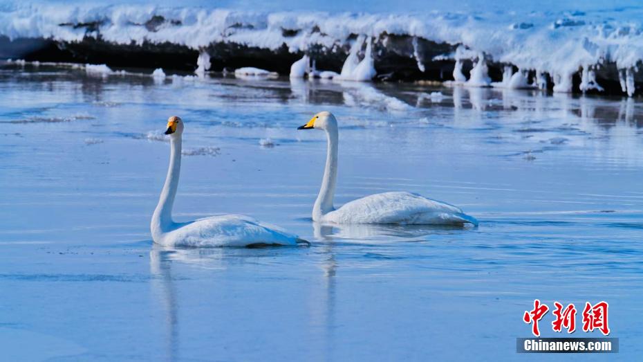 圖為天鵝在冰面上曬太陽。巴圖那生 攝