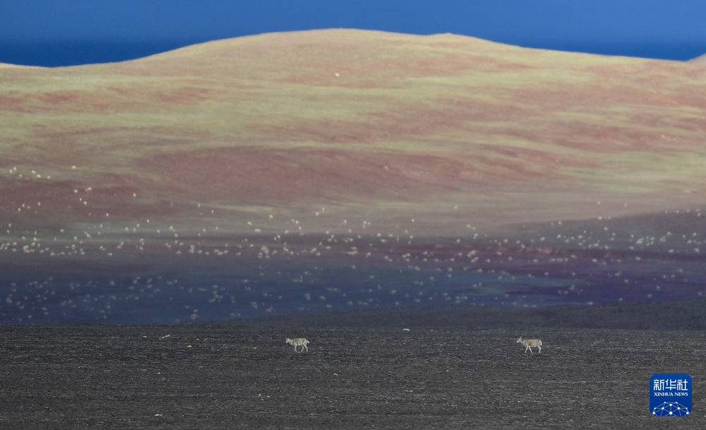 這是2020年7月7日在可可西里卓乃湖區域拍攝的兩只藏羚羊,后面的山坡上有大群覓食的藏羚羊。新華社記者 張龍 攝