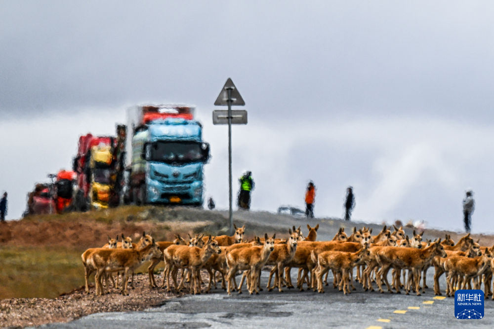 2024年5月27日,藏羚羊在可可西里五道梁地區通過青藏公路。新華社記者 張龍 攝