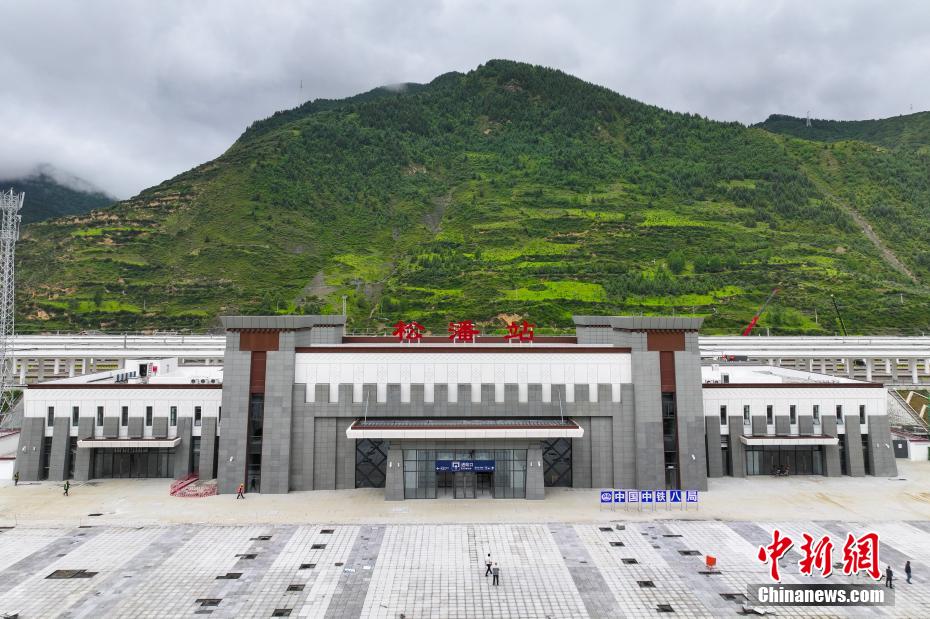 圖為7月7日拍攝的川青鐵路松潘站站房外景。(無人機照片)中新社記者 劉忠俊 攝