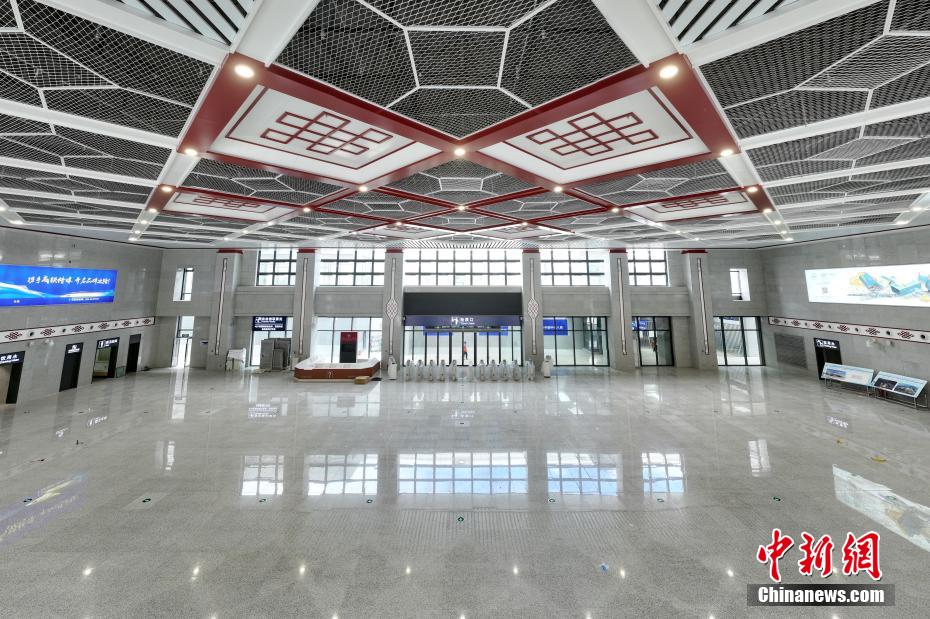 圖為7月7日拍攝的川青鐵路黃龍九寨站候車大廳一角。(無人機照片)中新社記者 劉忠俊 攝