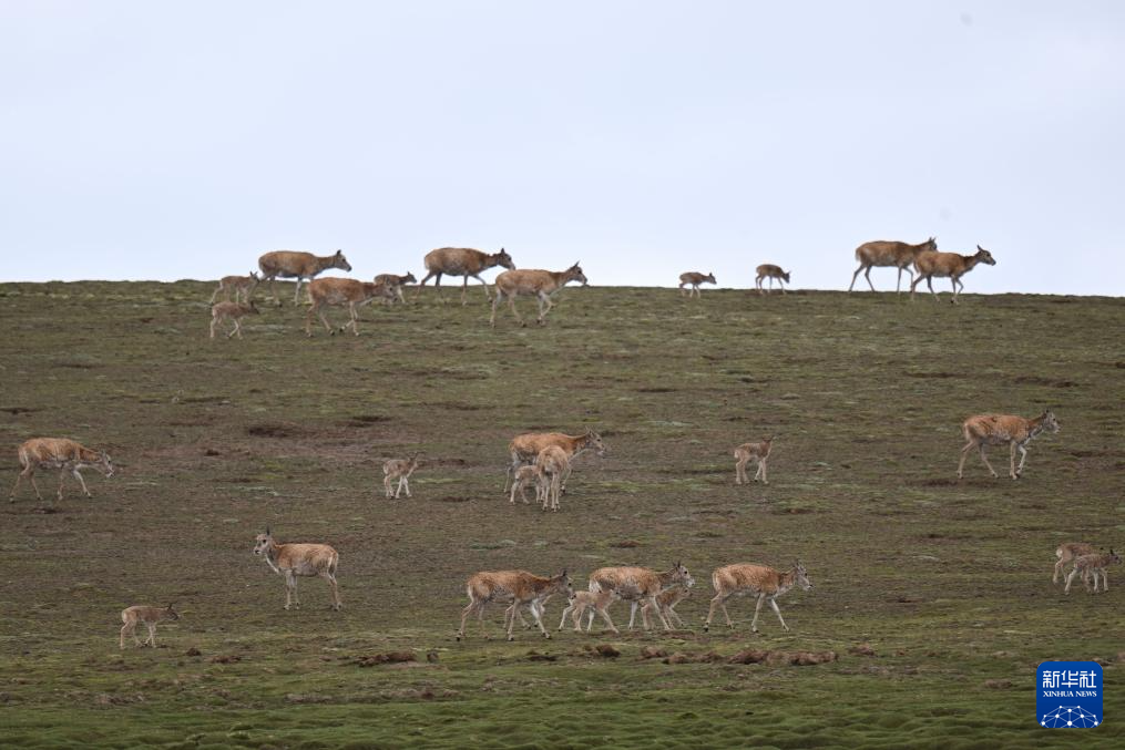 卓乃湖位于世界自然遺產地可可西里腹地。今年5月以來,來自青海三江源、新疆阿爾金山、西藏羌塘等地的雌性藏羚羊陸續遷徙至卓乃湖區域產仔。7月下旬開始,產仔結束后的雌性藏羚羊將再攜幼仔返回原棲息地。