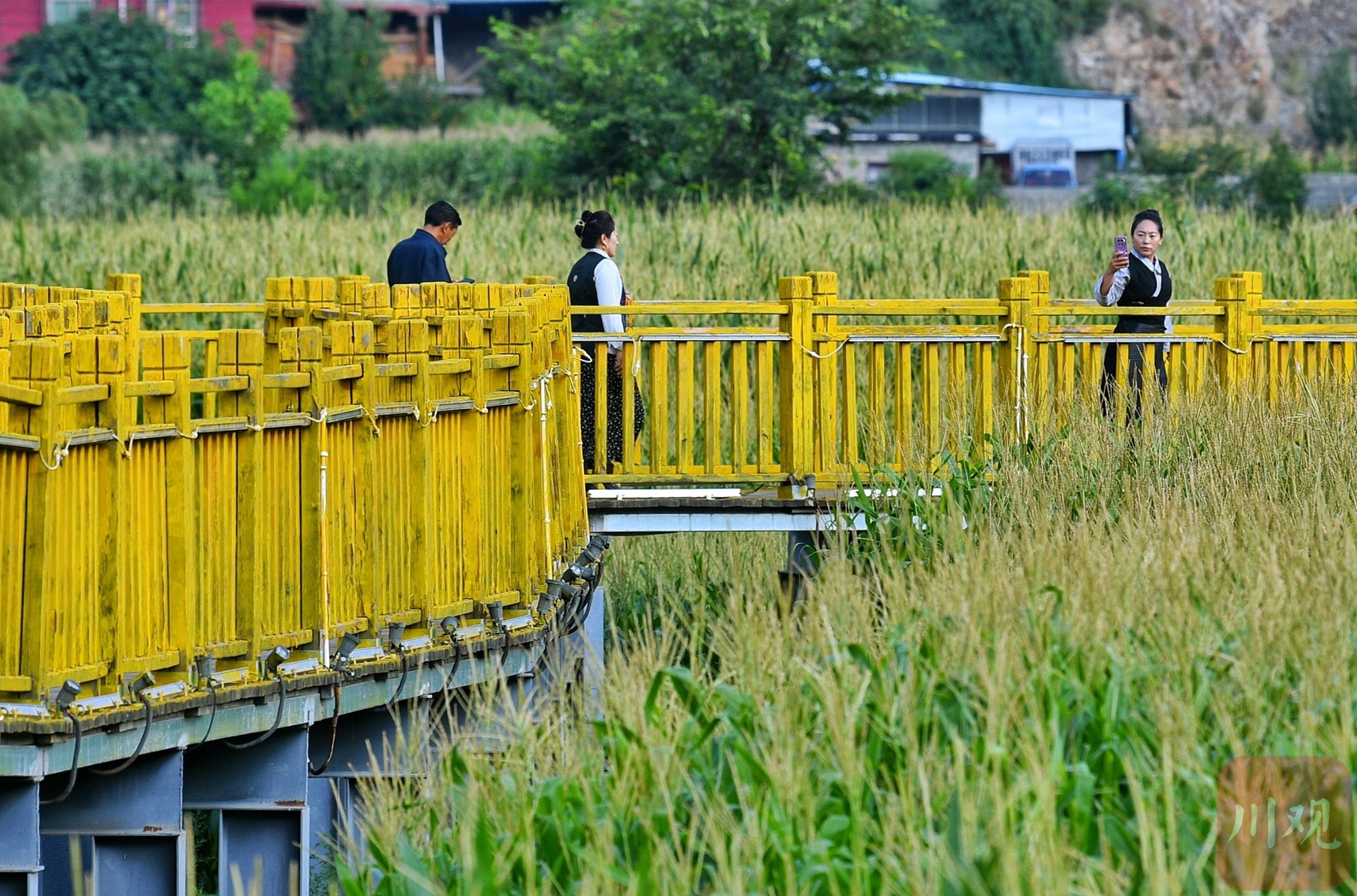 28日晨,記者從住地步行到縣城邊的“田園棧道”,只用了10分鐘。此時(shí)晨光中天色已泛藍(lán),田地里懸空架起的棧道,從郁郁蔥蔥的玉米田里一直曲折延伸,從空中俯瞰如同黃色哈達(dá)纏繞在翠綠田間,此景讓人眼前一亮。