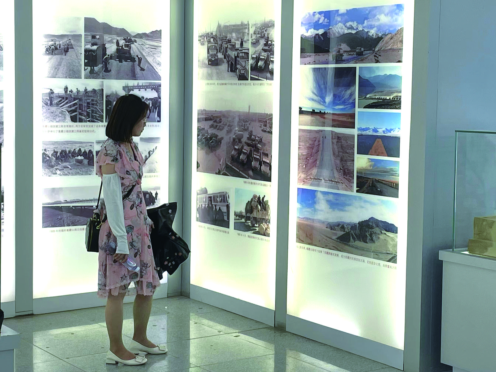 墻上方的格爾木至拉薩段縮略版圖清晰地展示著青藏公路修建翻越的昆侖山、風火山、唐古拉山、念青唐古拉山4座大山,高聳入云的山峰仿佛在云端訴說著當年的艱難險阻;跨越的楚瑪爾河、通天河、沱沱河3大河流奔騰咆哮著,似在吟唱英雄的贊歌。