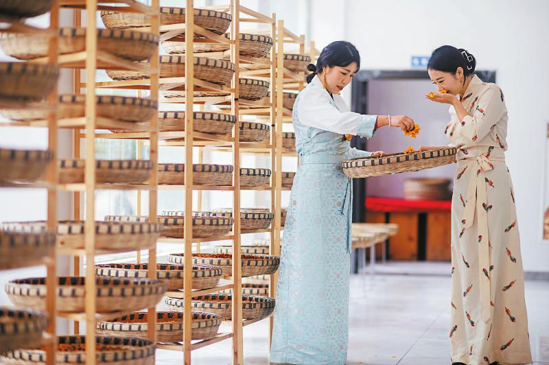 8月17日,阿壩州金川縣二嘎里鄉二嘎里村,返鄉創業青年侯正琴(左)與唐輝在晾曬雪菊。通過直播帶貨等多種形式,高原雪菊已成為該村的特色產業。何海洋 攝