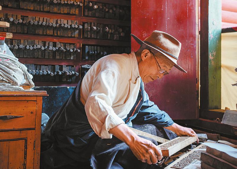 8月28日,甘孜州德格縣德格印經院,69歲的彭措澤仁在校對修復雕版。作為德格印經院藏族雕版印刷技藝的代表性傳承人,他已從事這項工作40余年。何海洋 攝