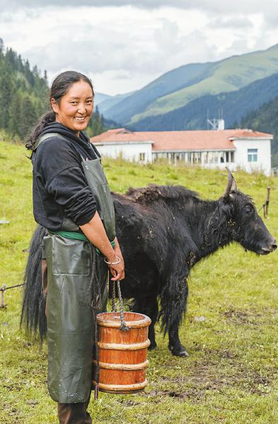 8月17日,阿壩州金川縣毛日鄉毛日村,村民蒲爾巴拉姆在牧場采集牦牛奶。采集的鮮奶會及時送至牛奶加工廠,為家里增加一筆可觀的收入。何海洋 攝