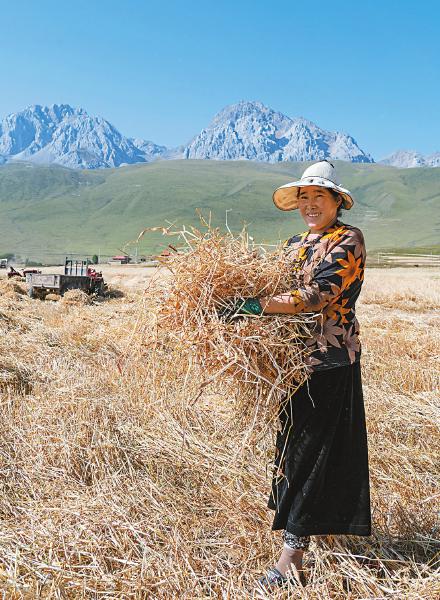 8月25日,甘孜縣仁果鄉有機青稞基地,聯合收割機完成收割后,德西青措將青稞秸稈打捆。今年她家的青稞再次增產。何海洋 攝