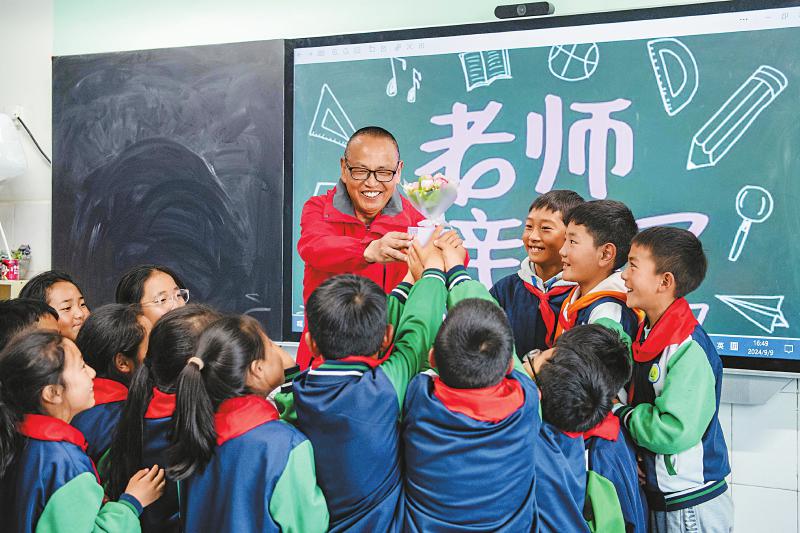 9月10日,2023年到阿壩州紅原縣城關小學支教的綿陽市鹽亭縣高渠小學張恩君老師收到了孩子們的教師節祝福。他克服各種困難,為高原孩子帶去知識。何海洋 攝