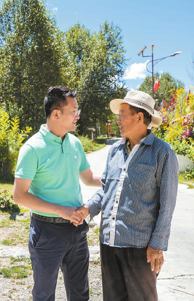 8月21日,甘孜州爐霍縣雅德鄉交納村“博士名譽村長”張藜山(左)與村民拉家常。自去年擔任“村長”以來,他致力于發展電商和旅游產業,成為鄉村振興的“新引擎”。何海洋 攝