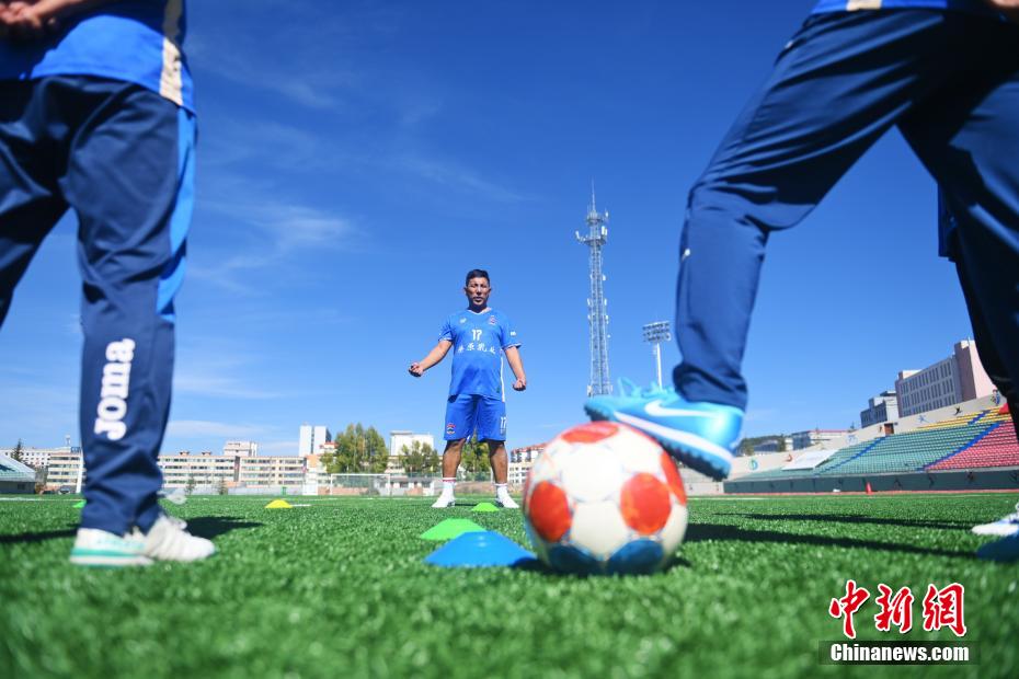 10月15日,在甘肅省甘南藏族自治州合作市一足球場內,甘南九二聯隊足球隊員進行訓練。