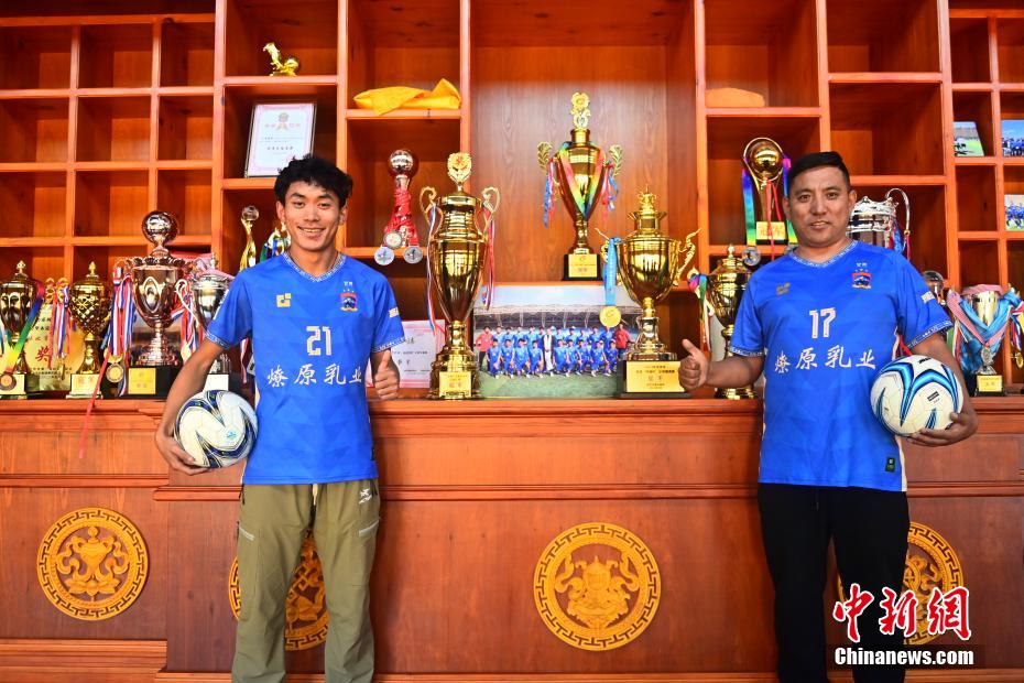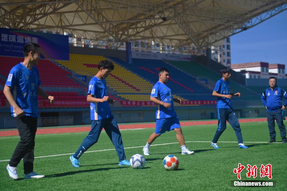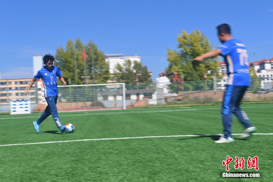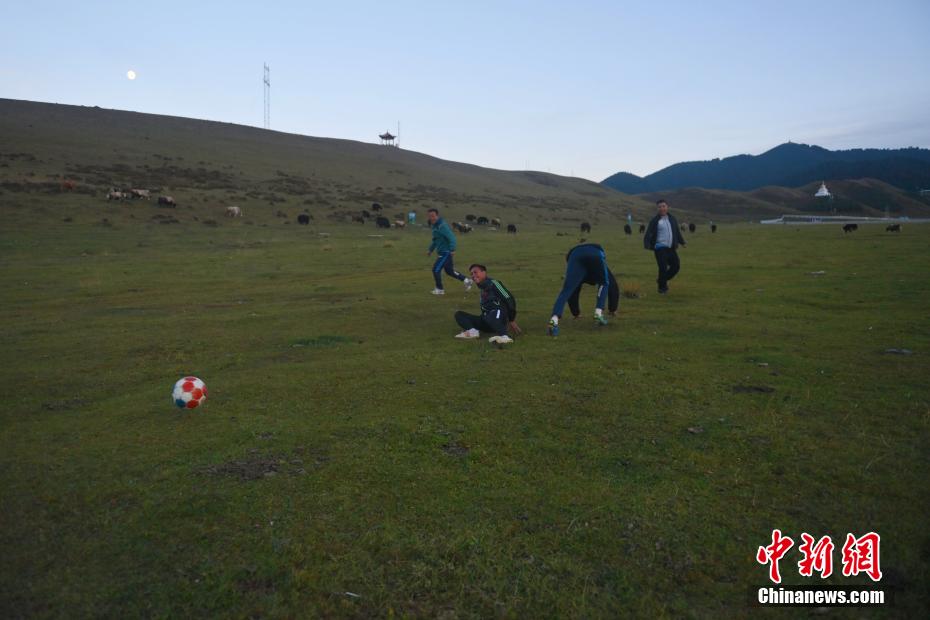 10月15日,在甘肅省甘南藏族自治州合作市一牧場內,甘南九二聯隊足球隊員進行訓練。該足球隊已成立32年,由牧民、務工者、歌舞演員、個體戶、老師、學生等組成,如今已歷經三代球員的成長。