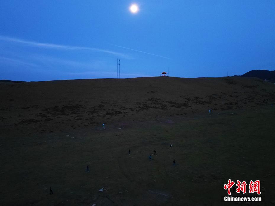 10月15日晚,在甘肅省甘南藏族自治州合作市一牧場內,甘南九二聯隊足球隊員在月下訓練。該隊隊員因為都在不同地方工作,所以長期自我尋找草場、牧區等近場地訓練,高原草場是他們訓練的一大優勢。