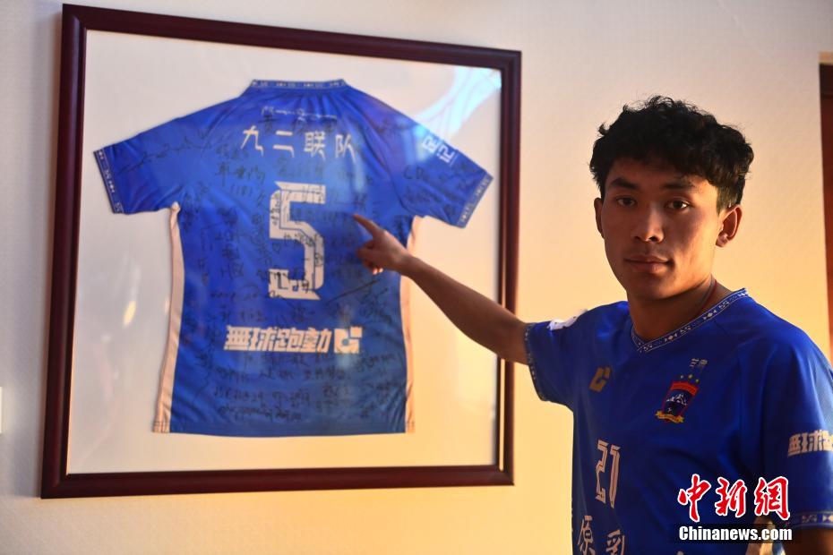 10月14日,在甘肅省甘南藏族自治州合作市甘南九二聯隊俱樂部榮譽展廳內,隊員更高才讓介紹該隊5號是中國足球協會杯第一個進球的藏族球員。
