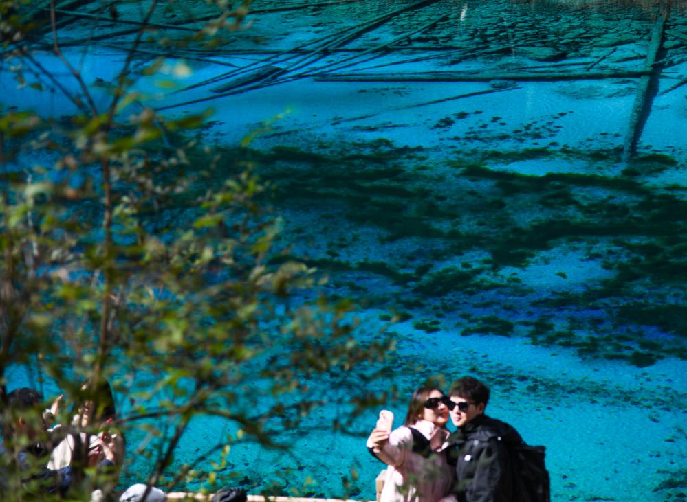 游客在九寨溝景區觀光留影。新華社記者 王曦 攝