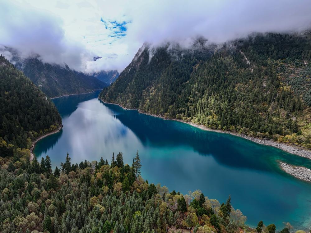 從高空中俯瞰,樹正溝、日則溝和則查洼溝3條主溝呈不規則的“Y”字形躺臥于九寨溝起伏的峰巒之間。數以萬計的游客散落在綿延40多公里的狹長溝谷內,卻并不顯得擁擠。