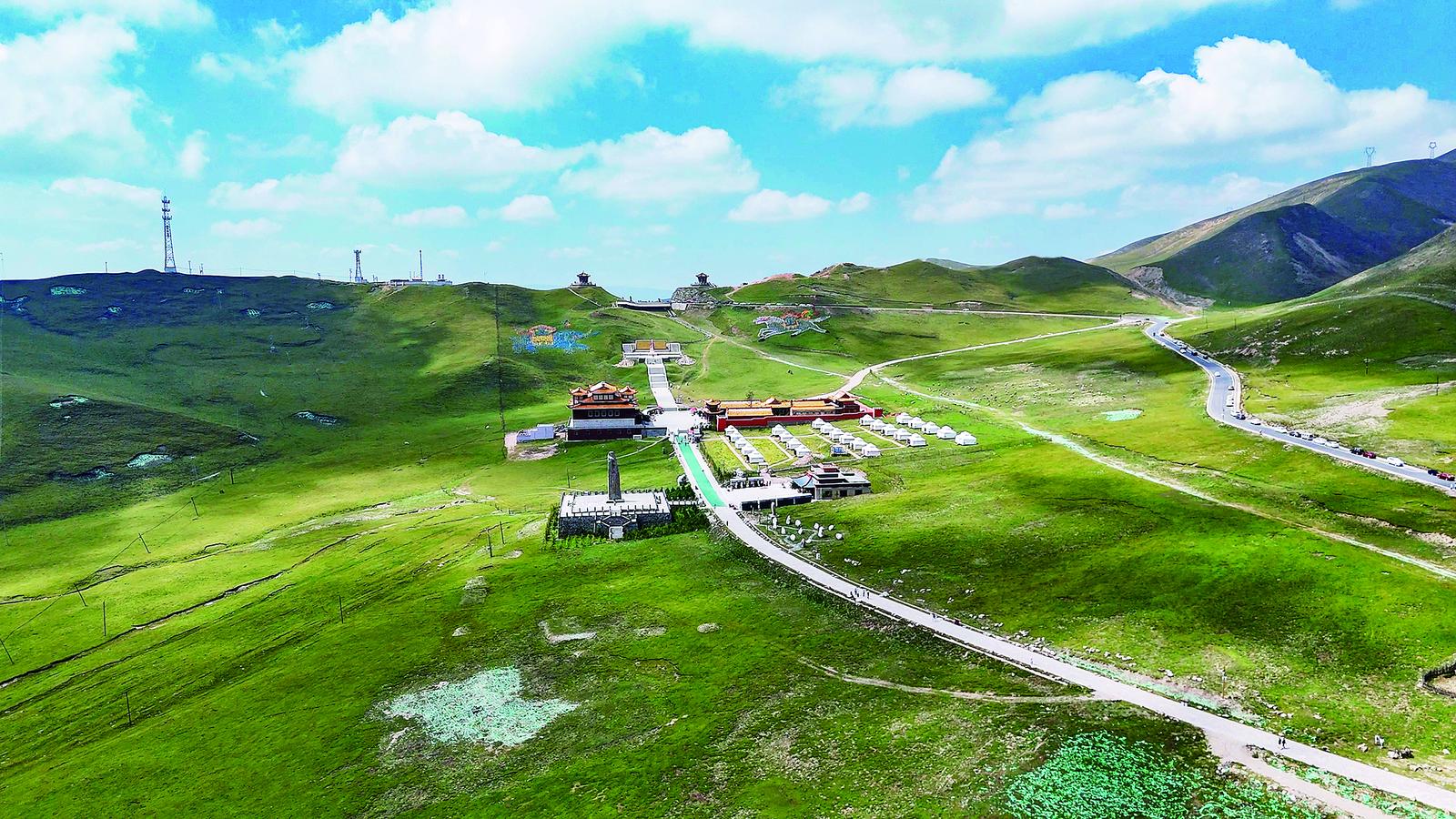 如今,唐蕃古道邊,文成公主雕塑靜靜矗立,端莊眺望遠(yuǎn)方,滿載思鄉(xiāng)之情。山麓文成公主廟,供奉松贊干布與公主塑像。日月山兩座山峰上的日亭、月亭,建筑精巧、金碧輝煌,充滿了特色。亭內(nèi)不僅有紀(jì)念文成公主進(jìn)藏的碑文和壁畫(huà),還有珍貴的唐蕃赤嶺分界碑等歷史文物。