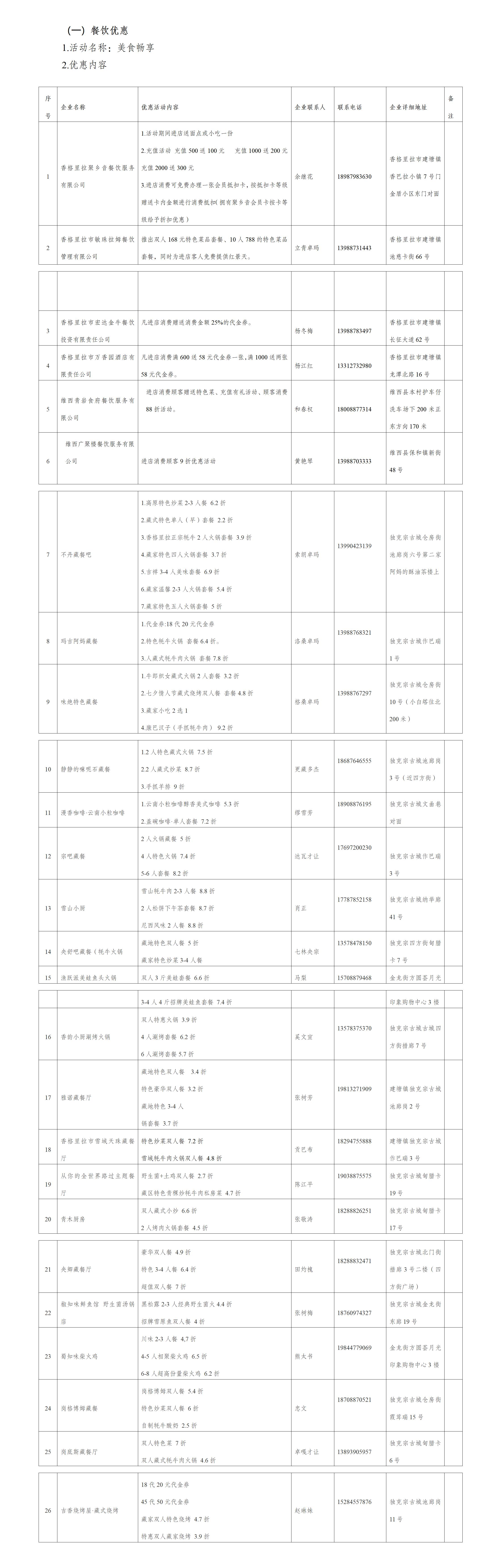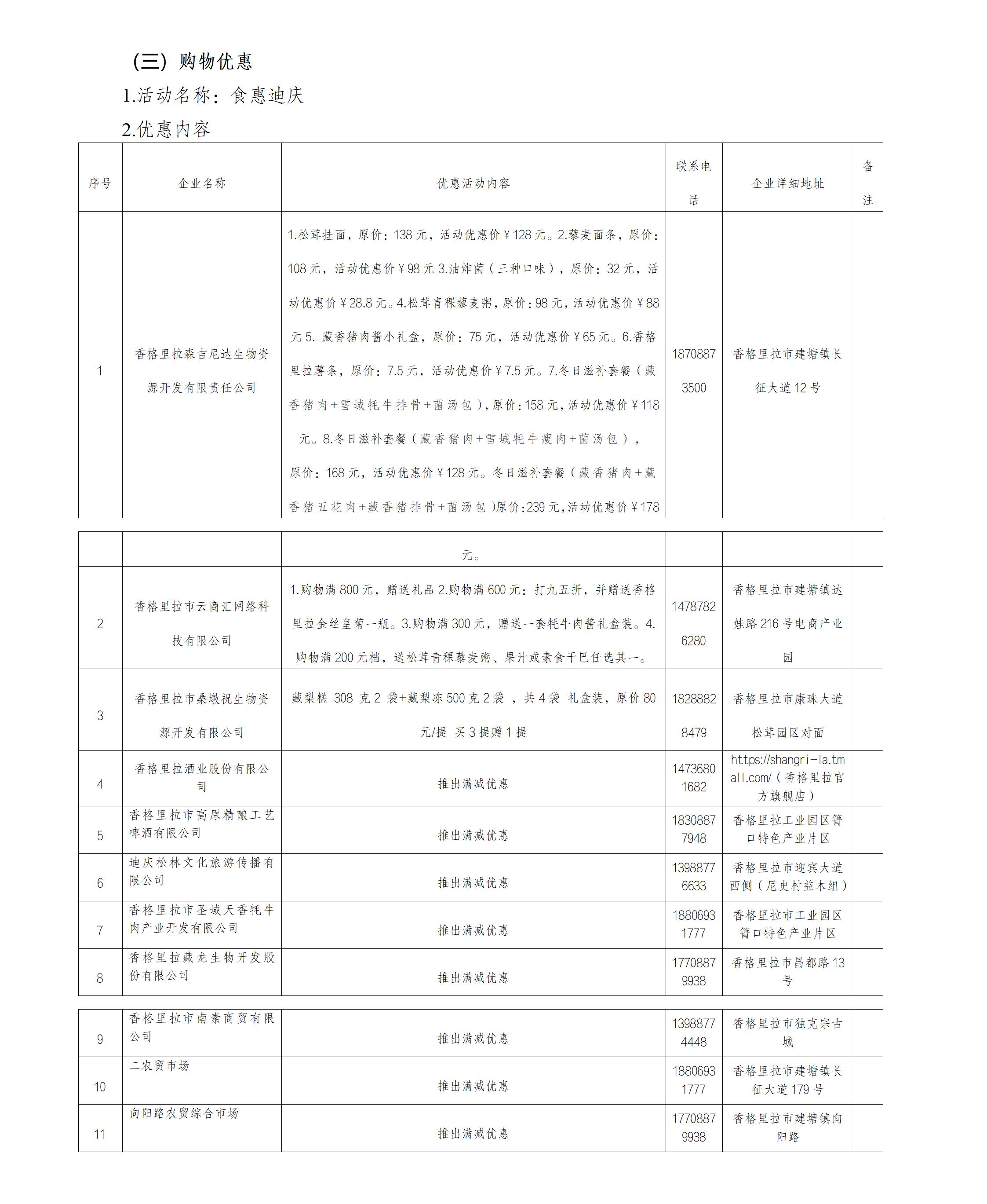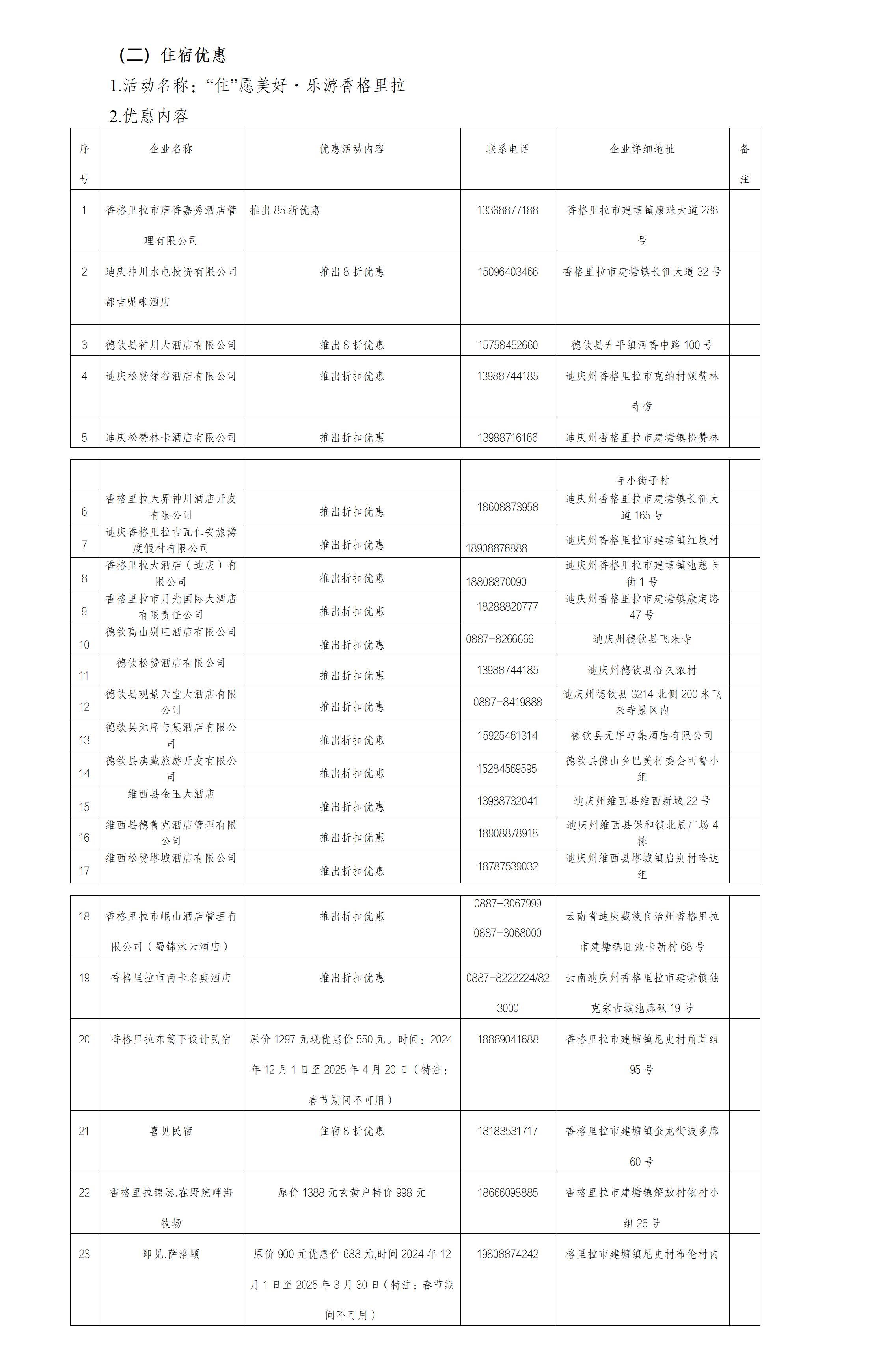 為熱烈迎接香格里拉的冬季旅游市場消費客群,迪慶商務部門在動車開通一周年之際特別推出一系列“吃、住、購”的優惠政策。6家線上特色餐飲企業及20家古城精選餐飲業將提供2.2折至9.2折的超值優惠,同時發放各類優惠券;19家優質線上住宿企業及州內百余家民宿將提供8折至8.5折的住宿優惠;10余家迪慶特色產品的生產銷售企業推出滿減折扣優惠、享受贈品的優惠福利,讓廣大游客樂游香格里拉提升旅游體驗。
