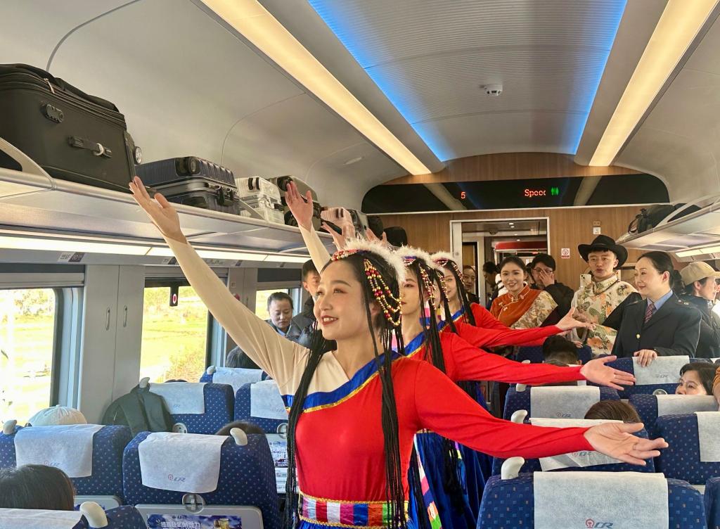 11月25日,“發現最美鐵路·尋夢香格里拉”活動中,乘務員向游客介紹麗香鐵路并表演節目。新華社記者 陸君鈺 攝
