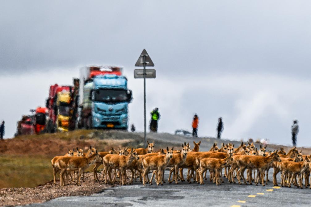 在可可西里,一群雌性待產藏羚羊通過青藏公路(5月29日攝)。新華社記者 張宏祥 攝