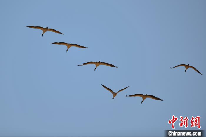 兩只黑頸鶴結伴翱翔,姿態優美。 江飛波 攝