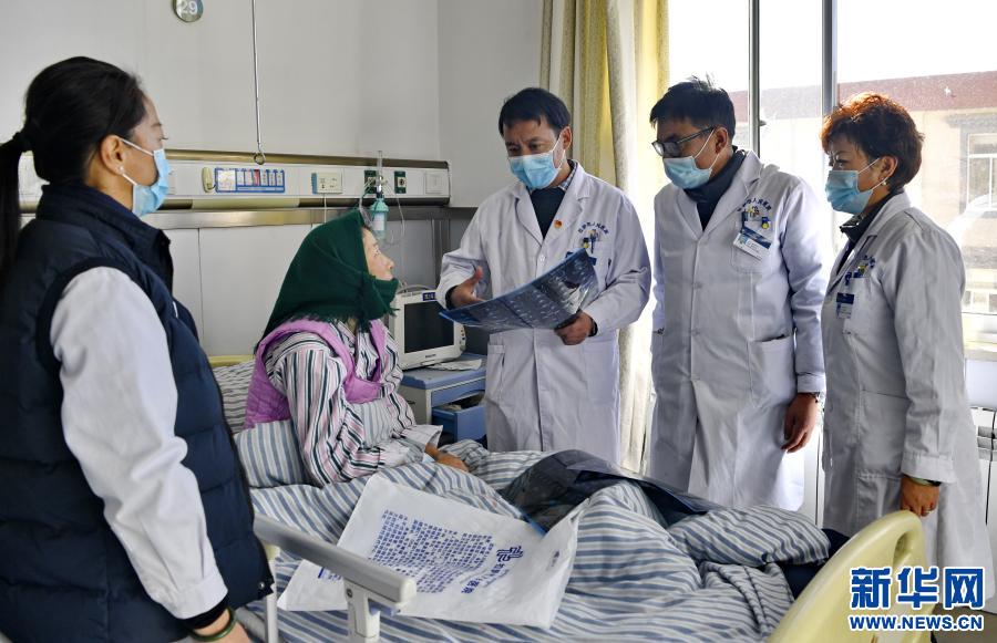 在拉薩市人民醫院病房,拉薩市人民醫院副院長妮瑪(左一)和主治醫師扎西云旦(中)、外科主任平措(右二)、醫務部主任德央(右一)做術前討論(2020年12月31日攝)。新華社記者 張汝鋒 攝