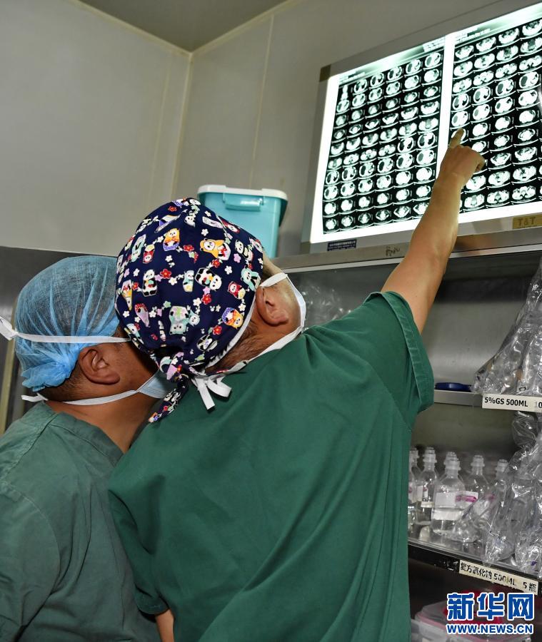 在拉薩市人民醫院第二手術室,兩位醫生在術前仔細觀察包蟲病患者的CT檢查圖像(2020年12月31日攝)。新華社記者 張汝鋒 攝