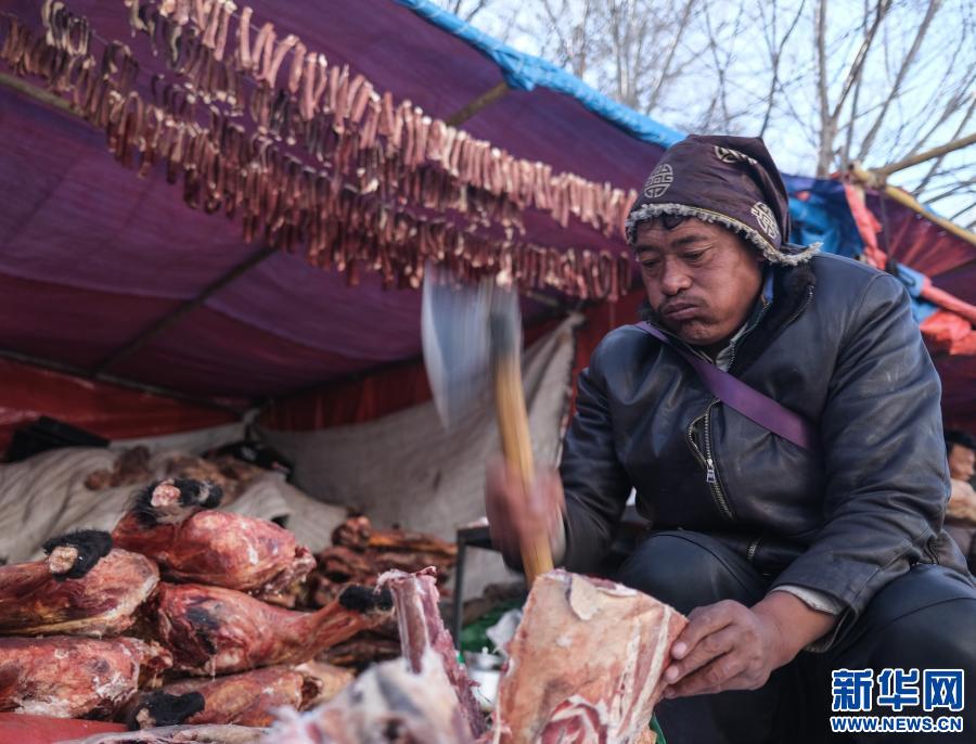 拉薩市當雄縣牧民波巴珠為顧客切割羊肉(2020年12月31日攝)。新華社記者 晉美多吉 攝