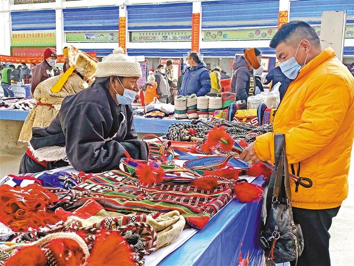 各大展臺(tái)上,牛羊肉、奶渣、酥油等農(nóng)畜產(chǎn)品,蟲草、貝母、人參果等中藥材,各具特色的民族手工藝品等,引得人們流連忘返。“我們的雪地靴是純手工制作的,皮毛一體,這里面是羊毛,很暖和,高筒的180元一雙,低筒的150元一雙,擺攤不到一小時(shí),我們已賣出了8雙。”來自雙湖縣嘎措鄉(xiāng)合作社的羅培笑逐顏開。據(jù)羅培介紹,這是他們合作社第6次參加該展銷會(huì),除了賣手工藝品,他們還賣牛羊肉。“只計(jì)算手工藝品,我們每次銷售額都在3萬元左右。”