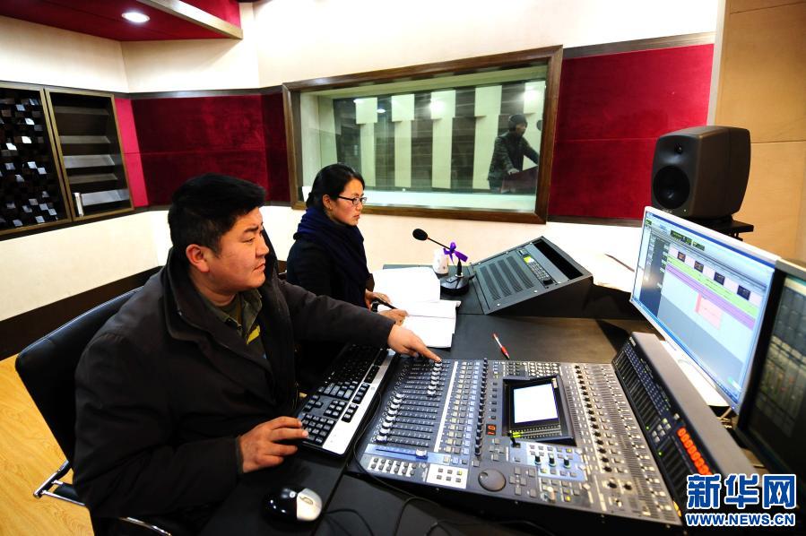 在中國西藏廣播電影電視藏語節目譯制中心,工作人員正在為影片《催眠大師》進行藏語配音(2015年12月11日攝)。新華社記者晉美多吉 攝