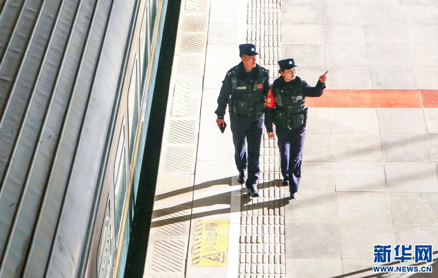 1月10日,“女子格桑花”警組民警雷穎君(右)與同事在火車站里巡邏。新華社發(胡安鵬、黃飛攝影報道)