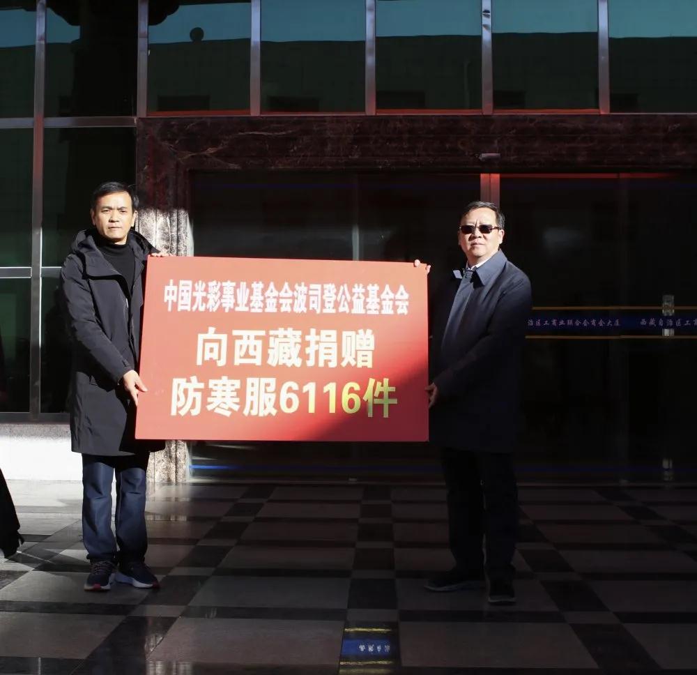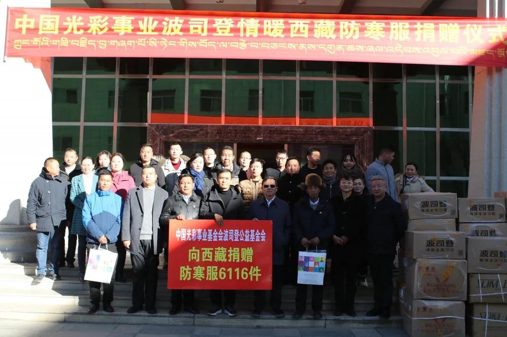 2021年1月8日,“中國光彩事業波司登防寒服情暖西藏”捐贈儀式在拉薩隆重舉行。西藏自治區黨委統戰部副部長、西藏自治區工商聯黨組書記王念東,波司登集團黨委副書記、波司登公益基金會理事長朱鈞,西藏自治區工商聯黨組成員、副主席陸紅軍,西藏自治區工商聯黨組成員、副主席、秘書長、西藏自治區光彩事業促進會秘書長張蓉出席了捐贈儀式。