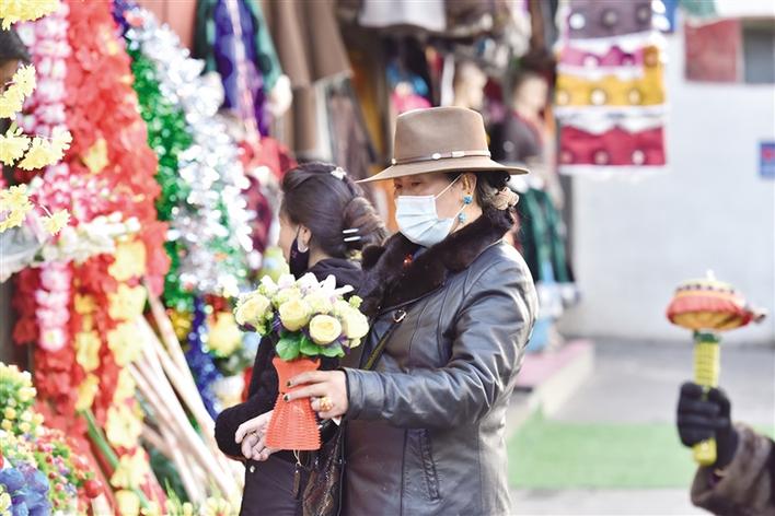 酥油花、青稞苗、藏式對聯……索朗的手上拿滿了年貨。今年29歲的索朗在日喀則市上班,趁著這次休假回拉薩,他帶著妻子和女兒一起過來購買年貨。“我們很早就過來了,就怕來得晚選擇性不多,現在年貨基本上都備齊了,再去買個切瑪盒就差不多了。”