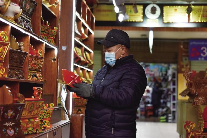 “有沒有和睦四瑞圖案的,給我看看。”“好嘞。”店主一邊打開盒子,一邊告訴記者,自己家的酥油花一對賣100元,如果購買者有需要也可接受定制,但要額外收取加工費。