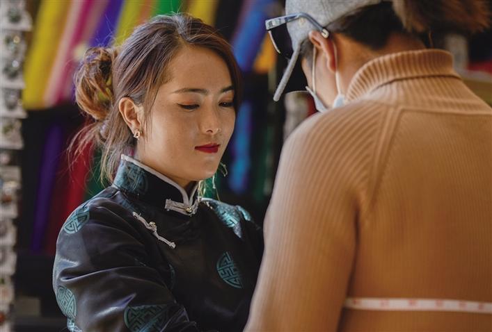 “老板,你家還有這款藏裝嗎?我想要一款。”在該店內,市民卓嘎拿出手機,指著格桑措姆錄制的藏裝短視頻說道。“有的,這是我們今年推出的新款,是對傳統的藏裝進行了改良,主要是體現在領口處,改良后的藏裝對領口部位進行了復古簡約化設計,使其兼具美觀性與舒適性,再搭配一個‘卡烏’堪稱完美。”格桑措姆介紹道。