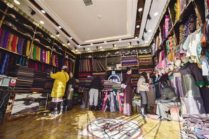 近日,記者來到位于神力時代廣場的666時尚藏裝店,剛進店門就被眼前琳瑯滿目的布料所吸引,一匹匹布料整齊地擺放在櫥窗里,讓人目不暇接。店內的顧客也在挑選著面料、款式,而藏裝店的老板也在不停地為顧客介紹今年的各類新款,供顧客選擇。