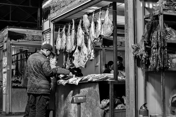 市民在藥王山農貿市場挑選牦牛肉。記者 張雪芳 攝