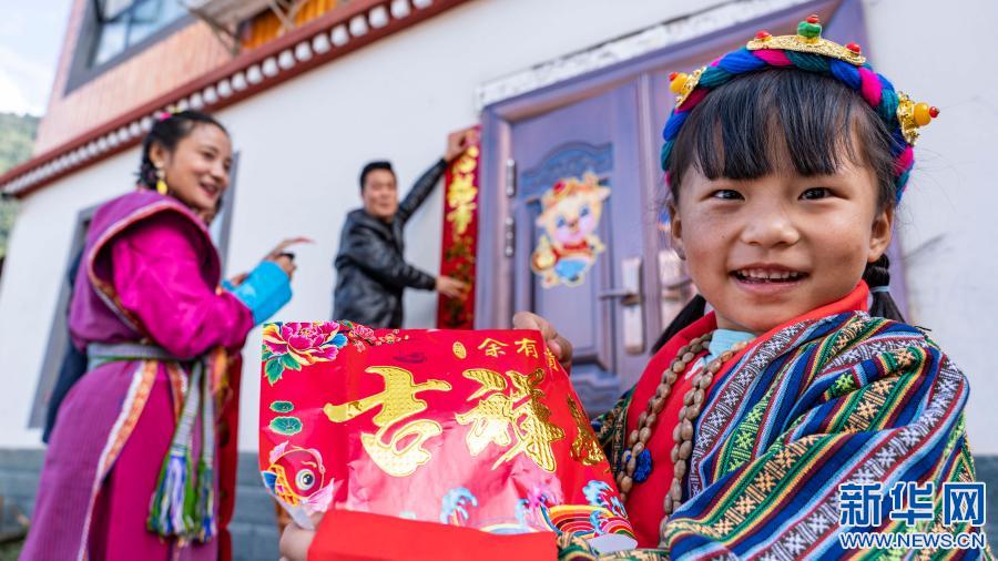 在西藏林芝市墨脫縣,張淳煥一家三口在家門前貼對聯(lián)(2月11日攝)。新華社記者 孫非 攝