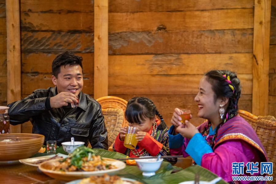 張淳煥一家三口在親戚開的農(nóng)家樂里舉杯共慶新年(2月11日攝)。新華社記者 孫非 攝